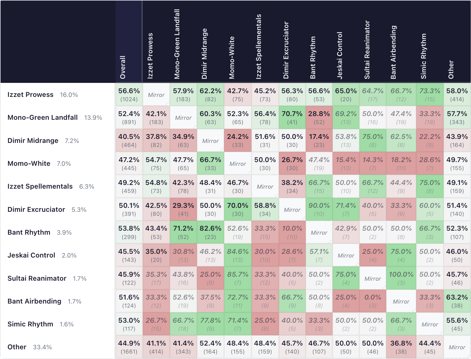 The meta is pretty favourable, with many good matchups. Landfall being one of the top decks has been especially good, since Golgari Airship matches up really well against it.